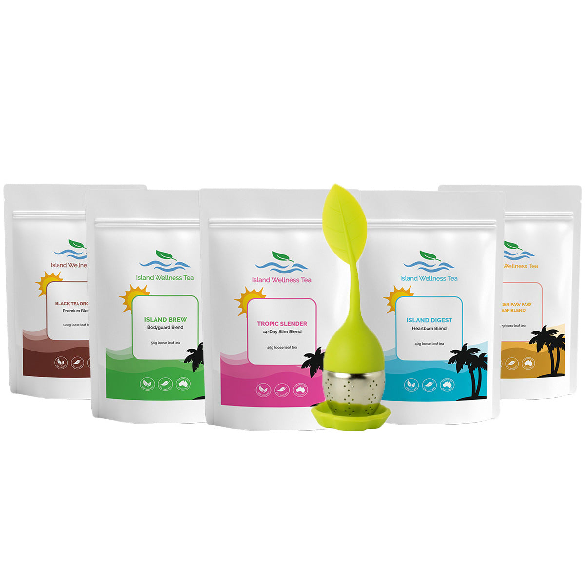 Choose five of any of our great tea flavors below and add them to the cart with our popular Leaf Tea Strainer and get 10% off.